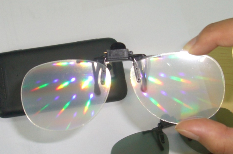 The gradient light diffraction effect in these glasses is layered between two hard plexi-plastic panels for protection.